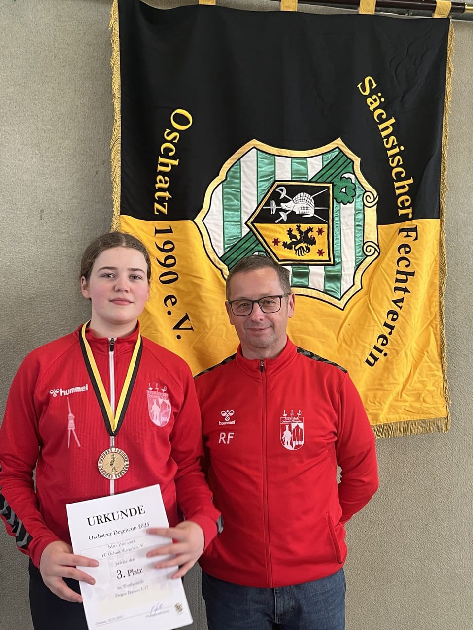 Beim Oschatzer Degencup erreichte Larissa von Bogendorff nach einer ausgezeichneten Vorrunde den 5. Platz bei den Senioren und den 2. Platz in der U20. Im Herrendegen belegten Oleksandr Stepanov den 25. und Thomas Härtel den 28. Platz in einem leistungsstarken Feld. Im Damendegen der U17 konnte sich Klara Drummer die Bronzemedaille sichern!