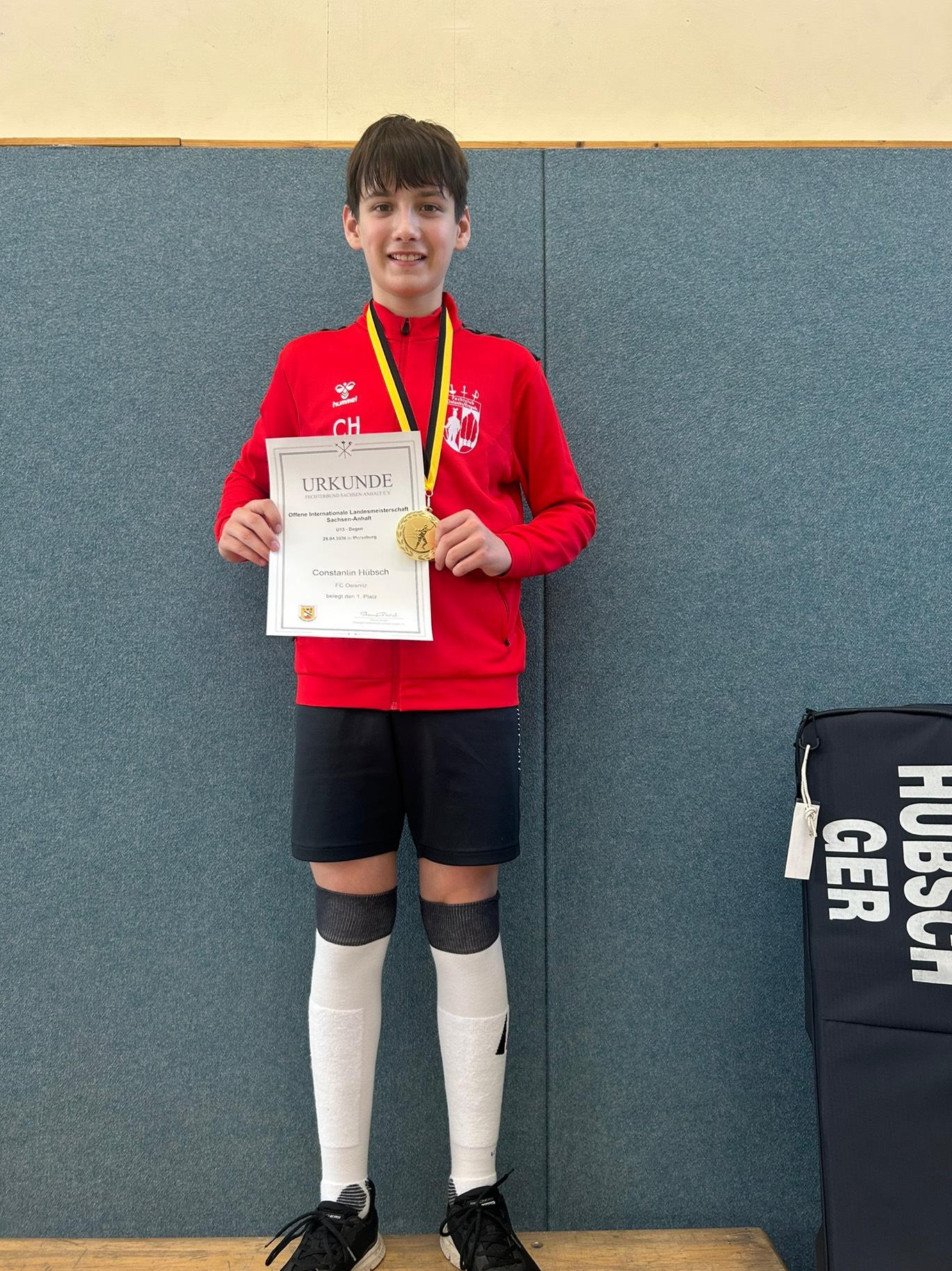 Bei den offenen Landesmeisterschaften Sachsen-Anhalt in Merseburg konnte sich im Herrendegen der U13 Constantin Hübsch sich den Titel holen. Nach fehlerfreier Vorrunde zog er sicher bis ins Finalgefecht und bezwang Ole Wahl (Dresdner FC) mit 10:7.